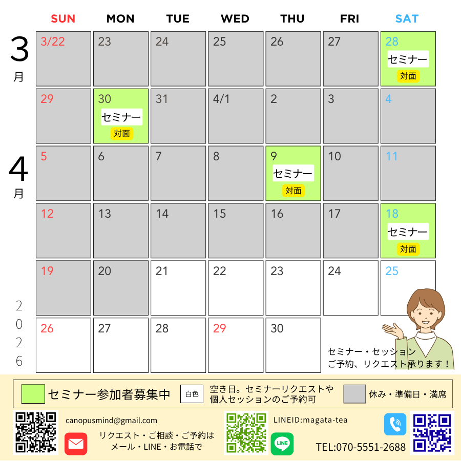 セミナー・個人セッションのご予約、リクエストのご相談は070-5551-2688(担当者携帯直通)