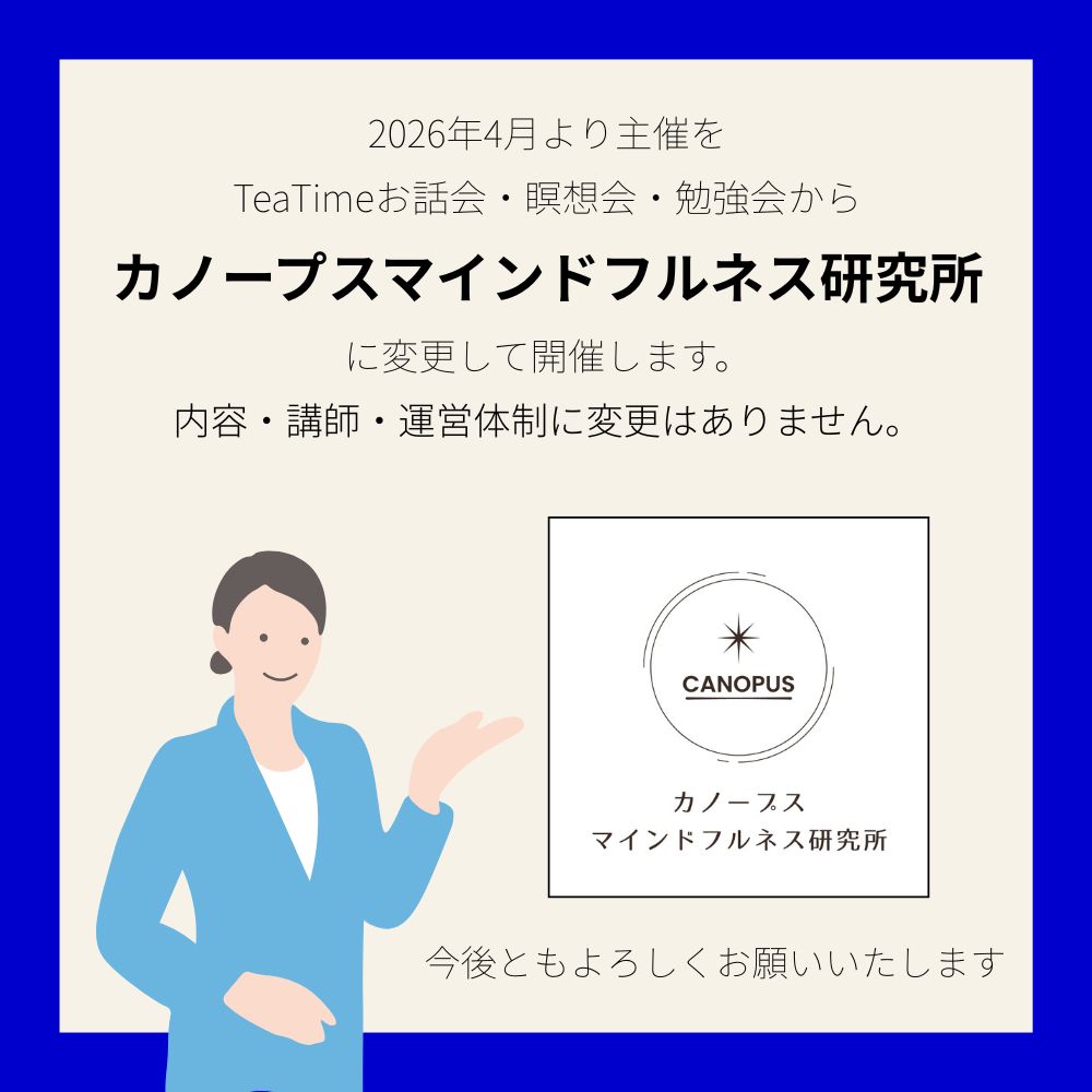 当サイトは、これまで「アトリエ ティー内面探求部(TeaTimeお話会・瞑想会・勉強会)」として開催してきたセミナー・セッション・瞑想会・学びの場を引き継ぎ、2026年4月より「カノープスマインドフルネス研究所」として活動体制を整えました。講師・提供内容・研究テーマは従来と変わらず、より継続的で体系的な内面探求の場として運営してまいります。