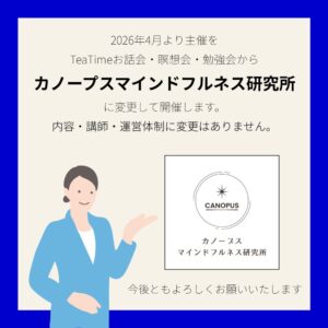 アトリエ ティー内面探求部として活動してまいりました「TeaTimeお話会・瞑想会・勉強会」が、「カノープスマインドフルネス研究所」に変わります。 内容・講師・運営体制※に変更はありません。 当サイトは、これまで「アトリ […]