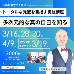 ご好評をいただいております、覚醒セミナー。リクエストをうけ、4月9日(木)のセミナー開催が決定しました!対面(大阪府枚方市くずは)です。ふるってご参加ください。